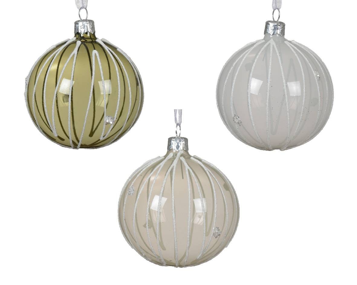 Dieses Set enthält sechs elegant gestaltete GlasKugel, die Ihrem künstlichen Weihnachtsbaum oder Ihrer Festdekoration eine edle, lichtdurchlässige Note verleihen. Dank feiner Glitzerlinien und zurückhaltender Farbtöne fügen sich die Kugel harmonisch in klassische wie moderne Arrangements ein und sorgen für stimmungsvolles Funkeln.