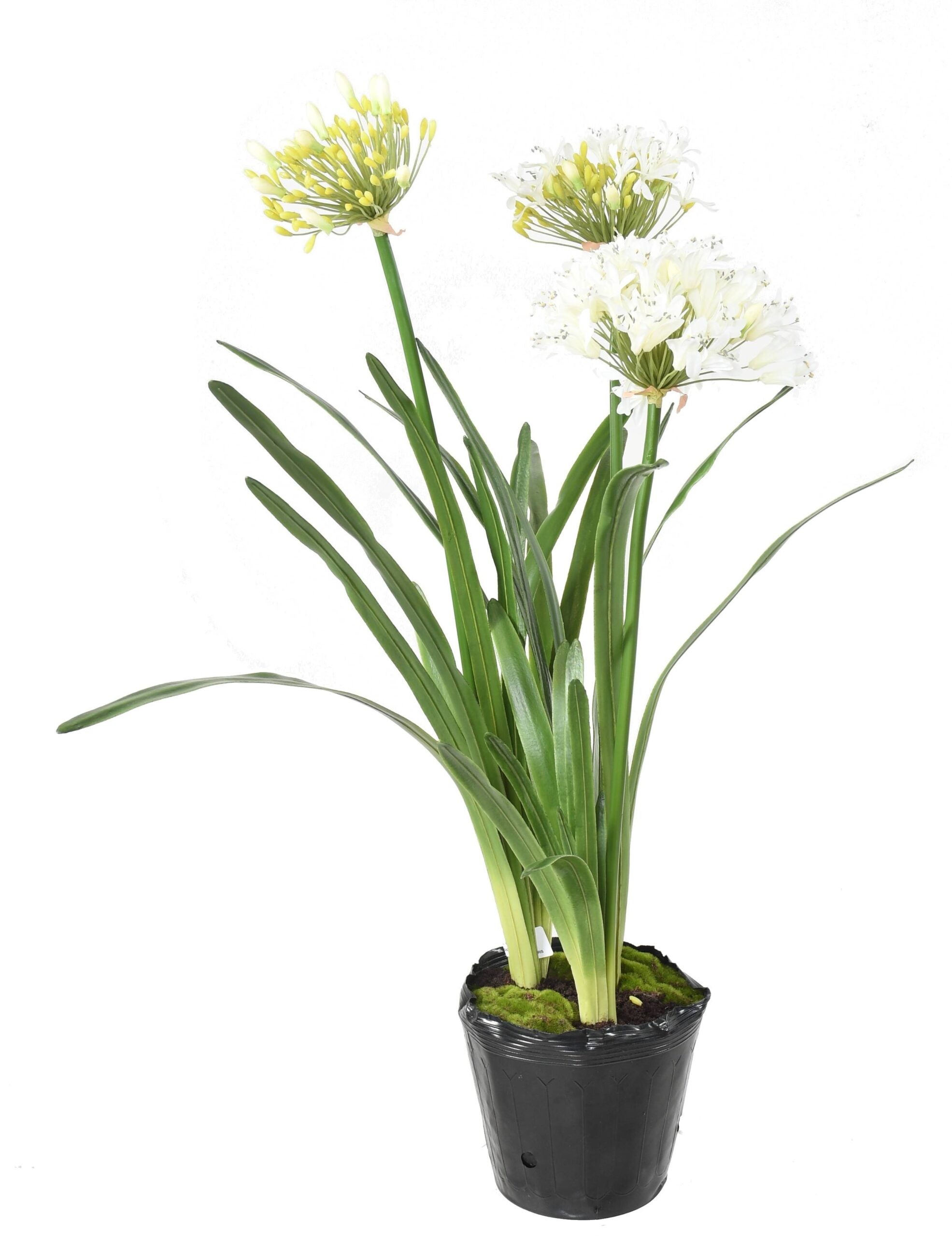 Diese künstliche Agapanthus (90 cm) überzeugt durch ihre naturgetreuen, weissen Blüten und das üppige Blattwerk. Die Pflanze ist bereits in einem schwarzen PVC-Topf mit Moosauflage arrangiert und eignet sich hervorragend zur langfristigen Dekoration – ganz ohne Pflege.