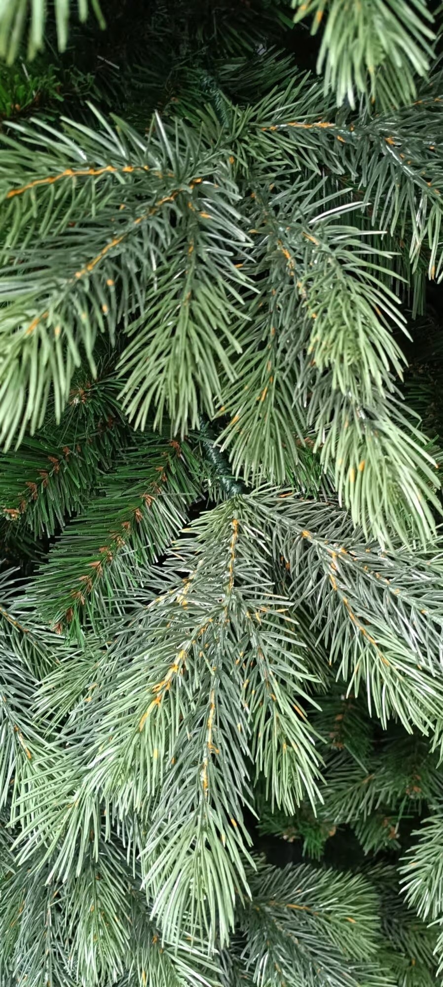 Realistischer PE/PVC-Mix: klassische PVC-Zweige füllen die Baumkrone, darüber liegen detailgeformte PE-Zweigspitzen in sanftem Farbverlauf von dunkel- zu mittelgrün. An der Zweigbasis sorgen dezente braune Akzente für den natürlichen Holz-Effekt.