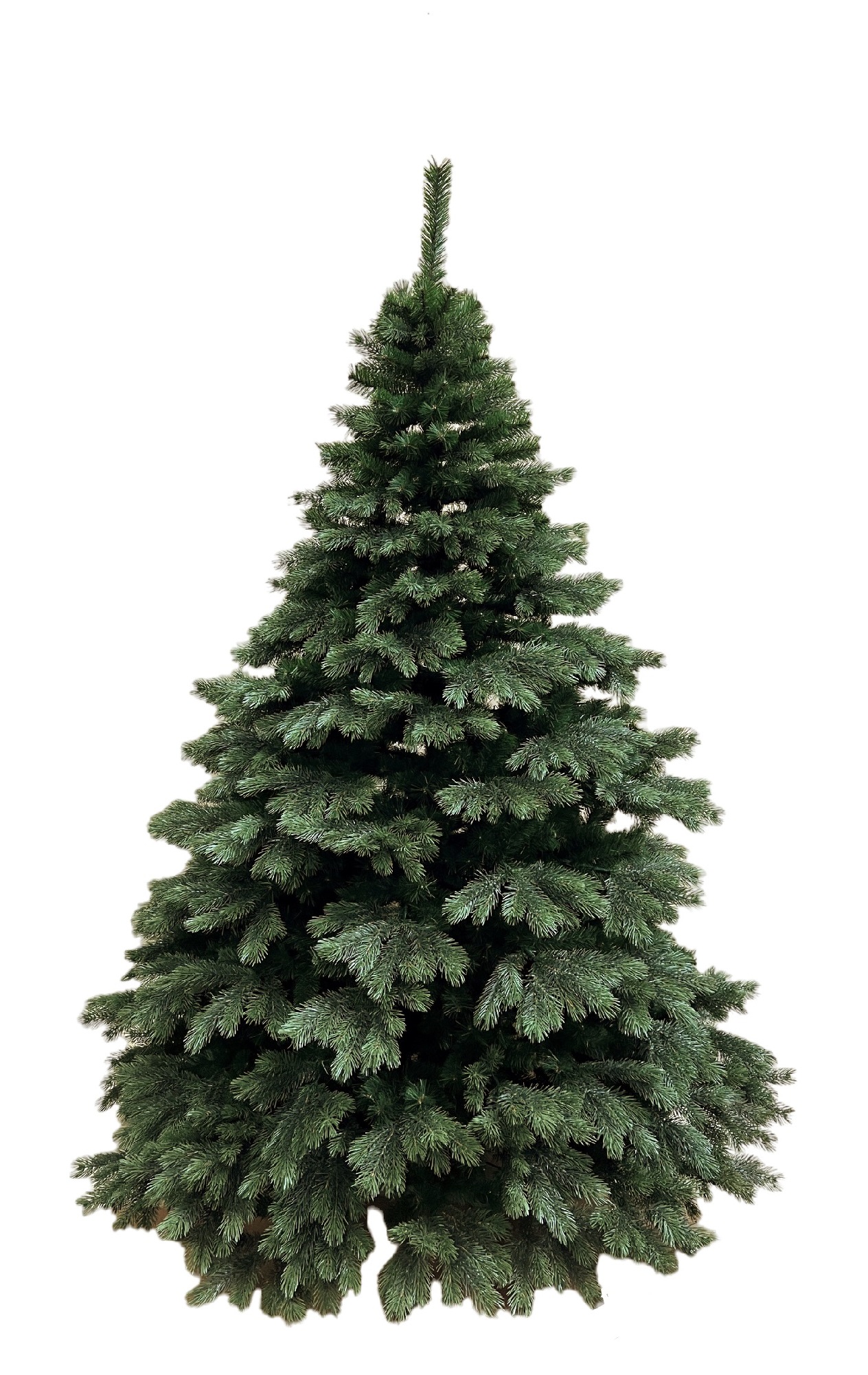 Realistischer PE/PVC-Mix: klassische PVC-Zweige füllen die Baumkrone, darüber liegen detailgeformte PE-Zweigspitzen in sanftem Farbverlauf von dunkel- zu mittelgrün. An der Zweigbasis sorgen dezente braune Akzente für den natürlichen Holz-Effekt.
