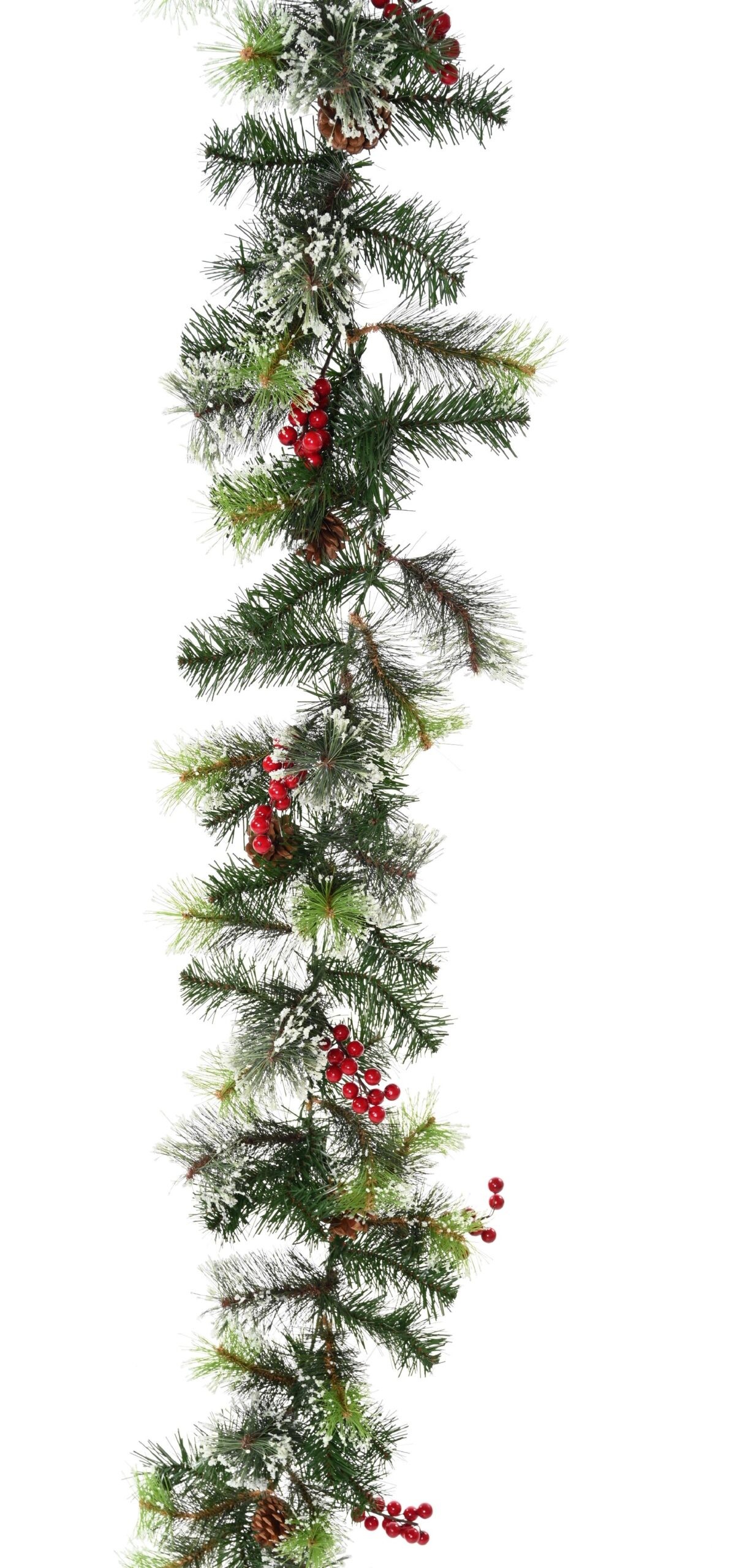 1 x Verschneite Tannengirlande mit Beeren & Zapfen, 270 cm – ohne Beleuchtung und weitere Deko.