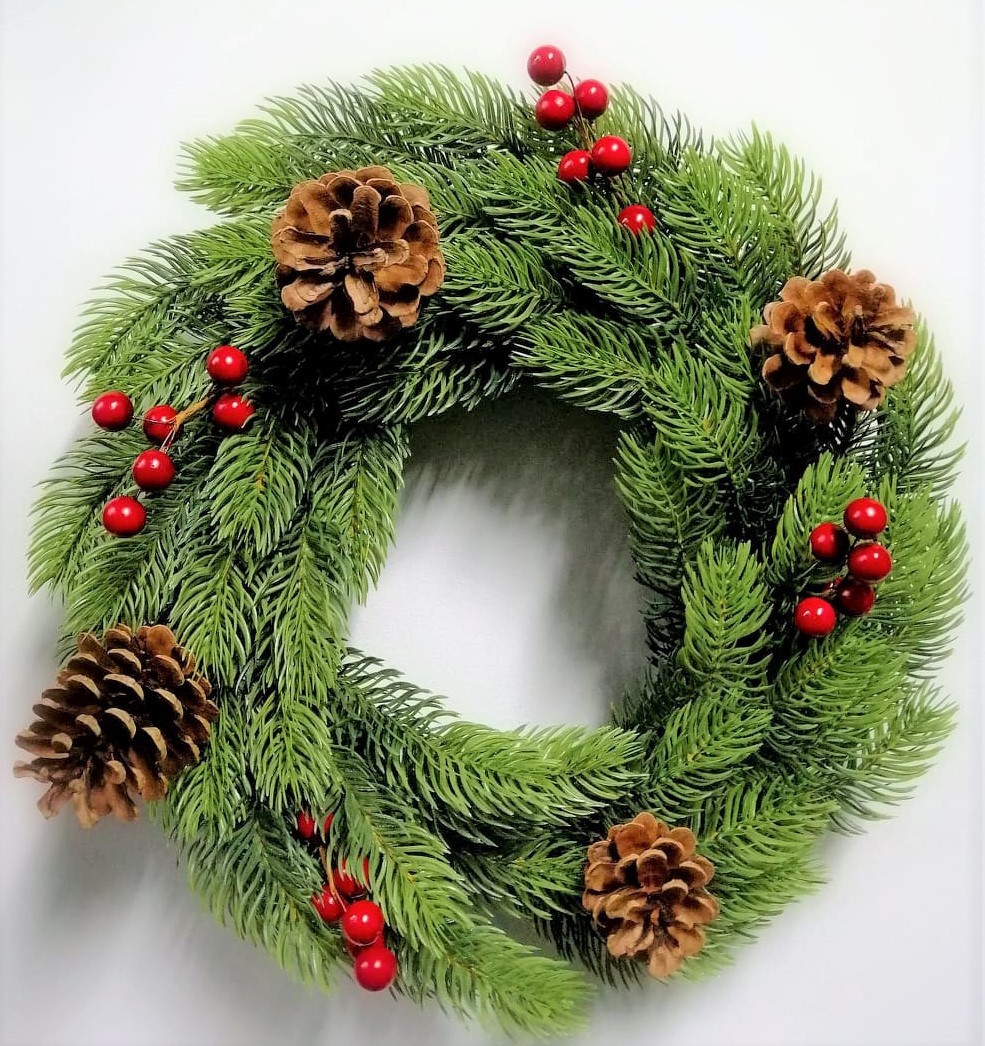 Der Winterzauber-Kranz „Classic“ (Modell 11-2) wird komplett dekoriert geliefert – mit roten Beeren und natürlichen Kiefernzapfen. Die formbaren Zweige in Full-PE Spritzguss-Qualität besitzen einzelne Nadelspitzen (Tips) mit lebendigem Farbverlauf: unten dunkelgrün, oben hellgrün. Ideal für Innenräume und geschützte Aussenbereiche.